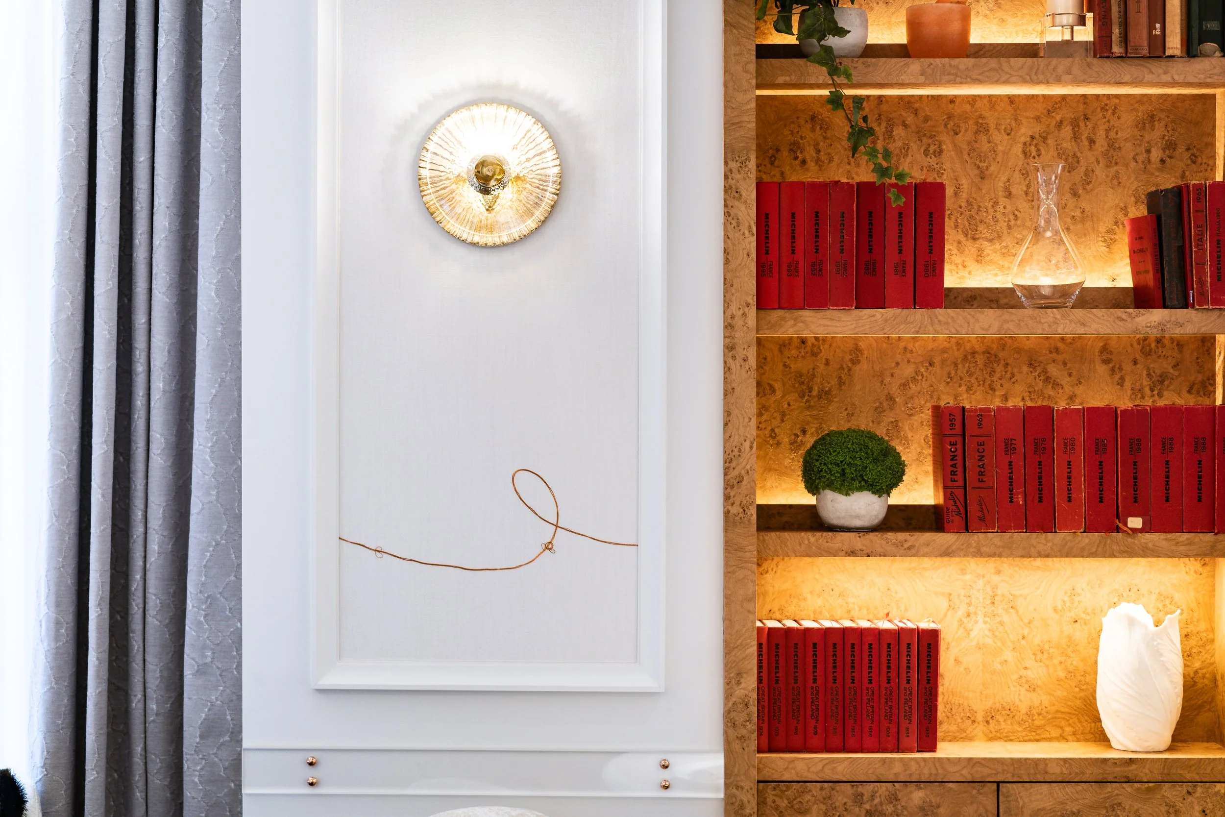 Created in my studio in the summer of 2023, the delicate metal embroideries are worked on white Belgian linen and span almost 17 meters as the art piece flows around the walls of dining space.