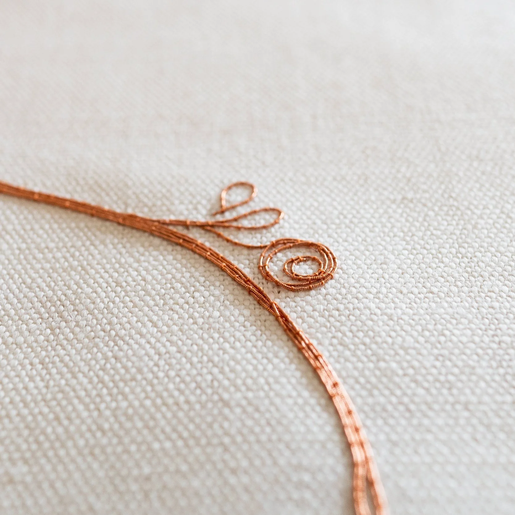 Working closely with the interior design practice Fabled Studio, I created a refined, contemporary response to the design with a modern take on the craft of goldwork embroidery, exploring how best to capture the play of light across the copper and celebrate the natural, flowing qualities of these beautiful bespoke threads.