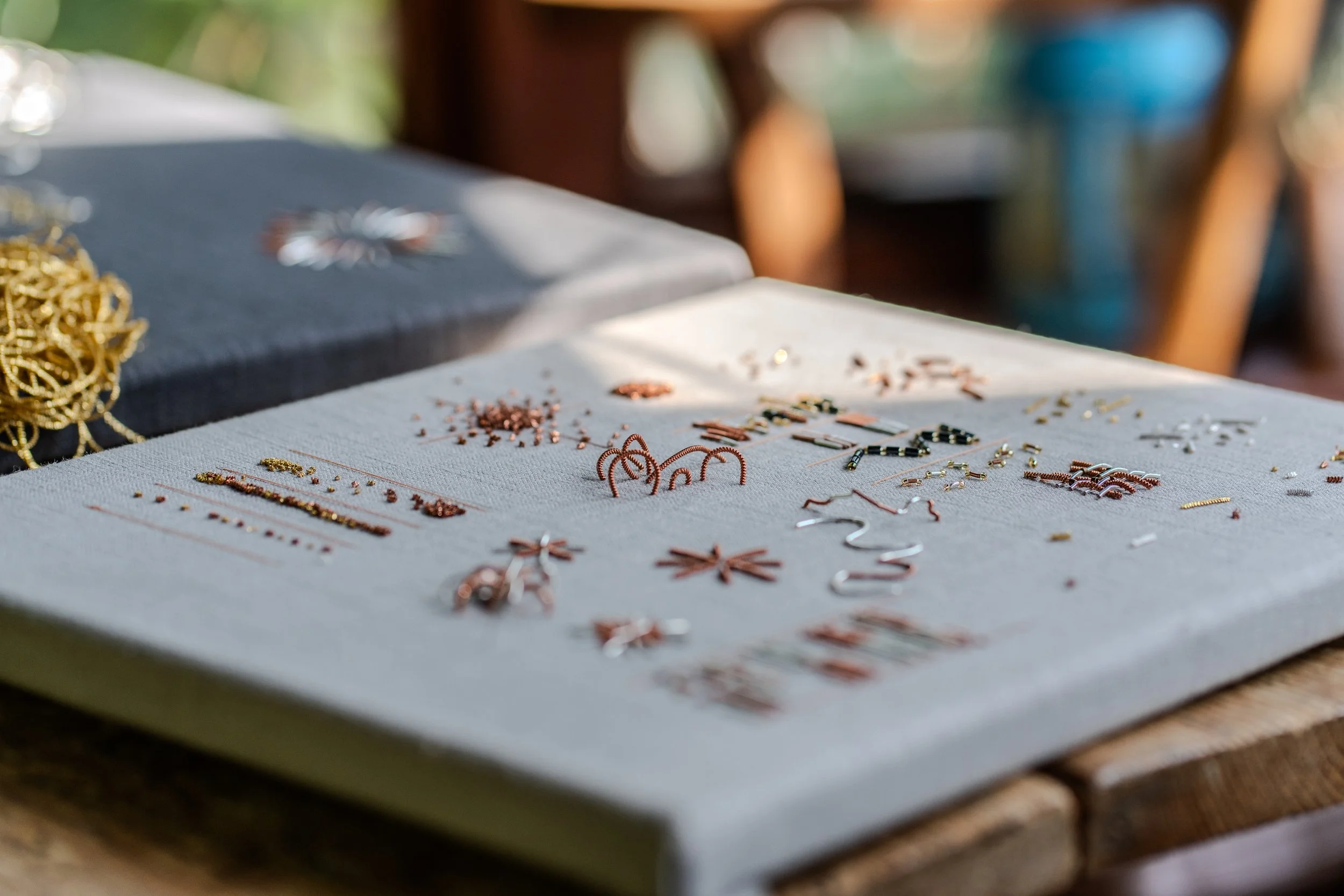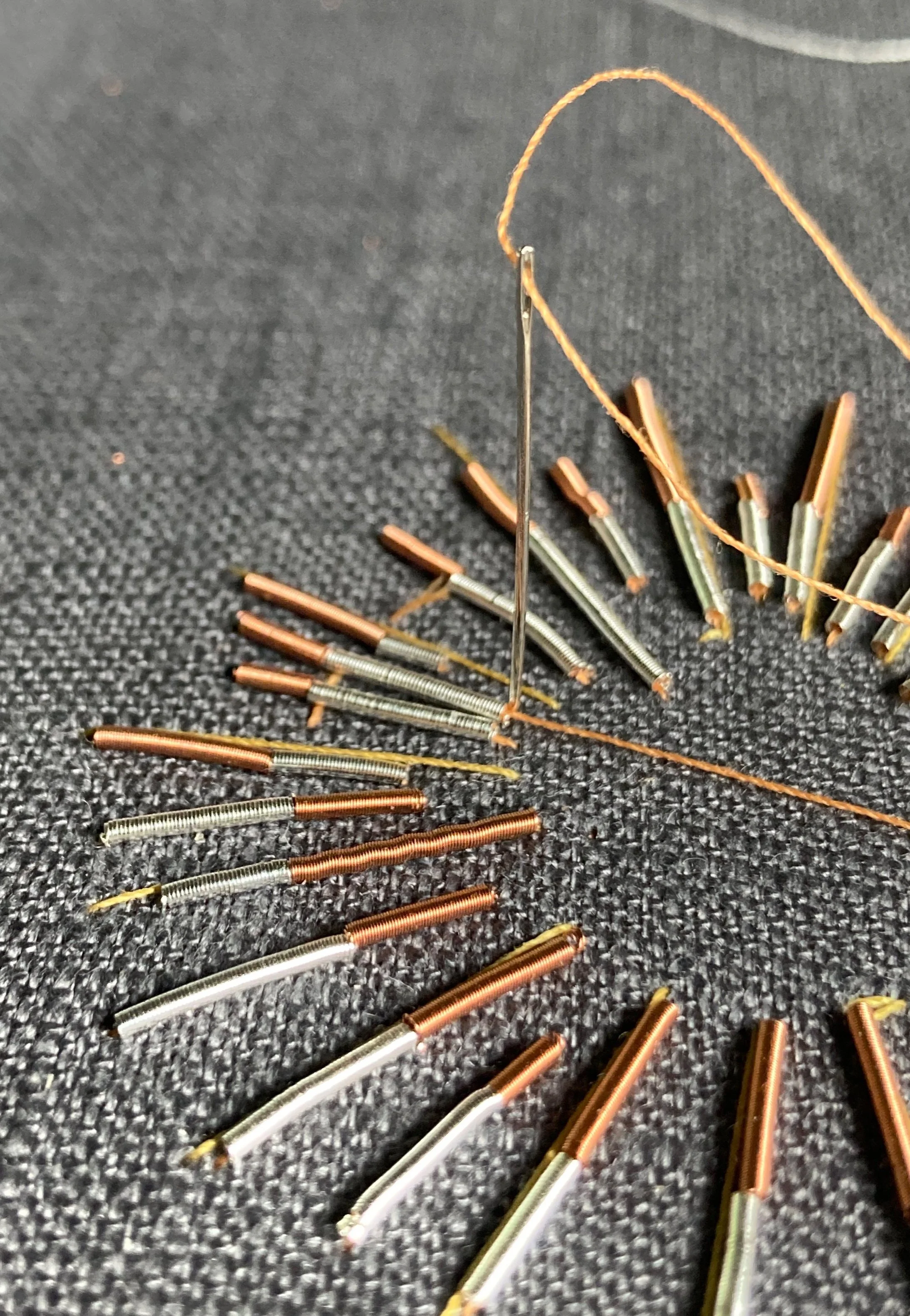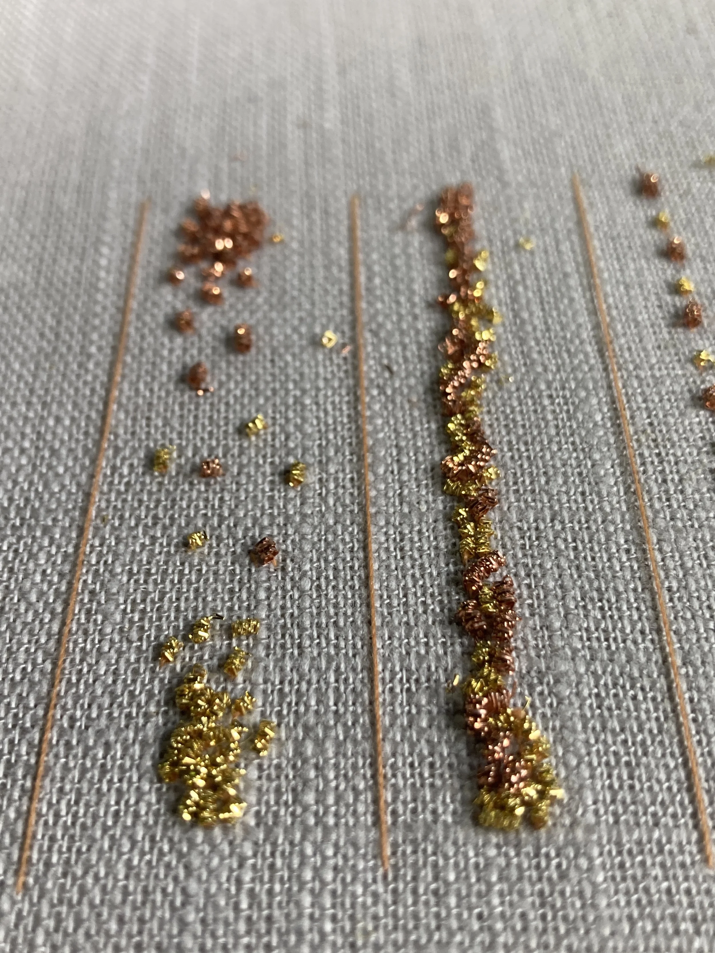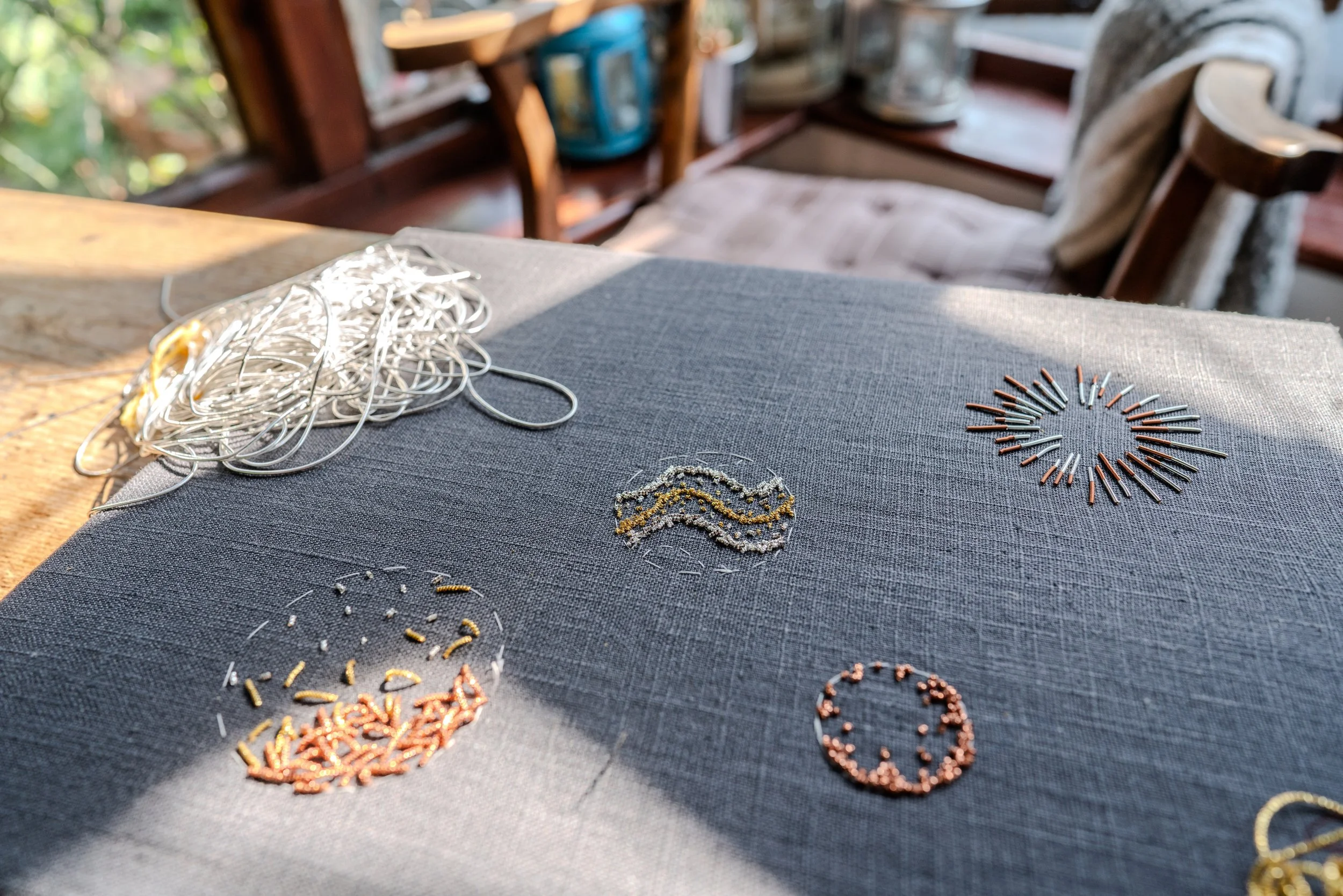 This workshop is designed with traditional goldwork metal purls in mind, and their very particular movement, sculptural qualities and the way they play with light. You are also welcome to use your own beads - metallic or other - and create your own unique effects with what you have.